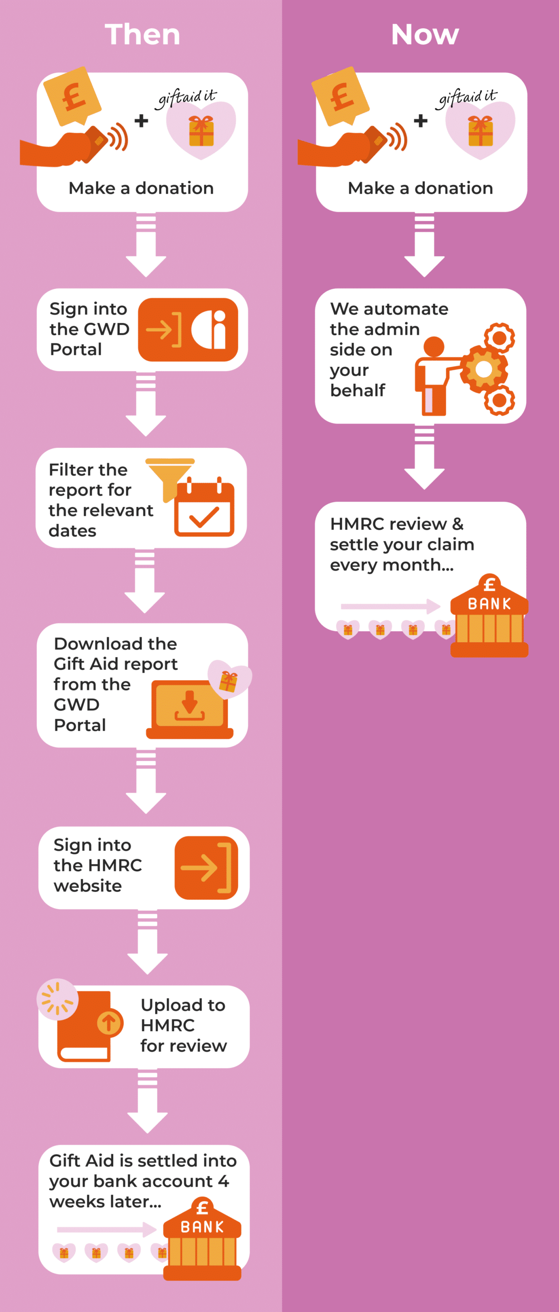 Gift Aid will be taken through the Donation Station as usual, but instead of manually making the claim in your own time, we will automate it for you.